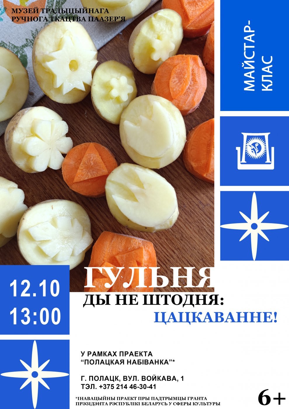12 октября в 13.00 Музей традиционного ручного ткачества Поозерья приглашает всех желающих на мастер-класс по изготовлению штампов и декорированию ткани «Гульня, ды не штодня: цацкаванне!» в рамках авторского проекта «Полоцкая набойка» при поддержке гранта Президента Республики Беларусь в сфере культуры.