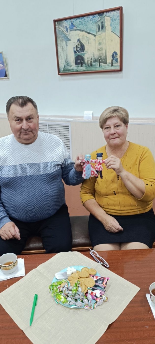 В теплой дружеской, почти семейной обстановке, за чашкой чая, в окружении выставки репродукций картин Николая Рериха, состоялся разговор о важном «Счастливая семья – сильное государство». Открыла мероприятие помощник Благочинного Ушачского района Анна Николаевна Пашкова, которая пожелала семьям крепости брака, взаимной любви и понимания, семейного благополучия, а также призвала к бережному отношению друг к другу и к укреплению семейных уз, в духе христианских ценностей и традиций. Семейные пары рассказывали об истории создания своих семей, о детях, внуках, семейных традициях, которые передались от бабушек-дедушек, родителей. В завершении разговора все присутствующие «украсили» дерево листочками, на которых написаны семейные ценности. А завершилась встреча мастер-классом, под руководством смотрителя Мугако В.К. пары сделали семейные обереги «Кукол-неразлучников».Молодые ребята с интересом слушали рассказы опытных семейных пар, а пока они мотали кукол, отвечали на вопросы викторины, вспоминали поговорки о семье.